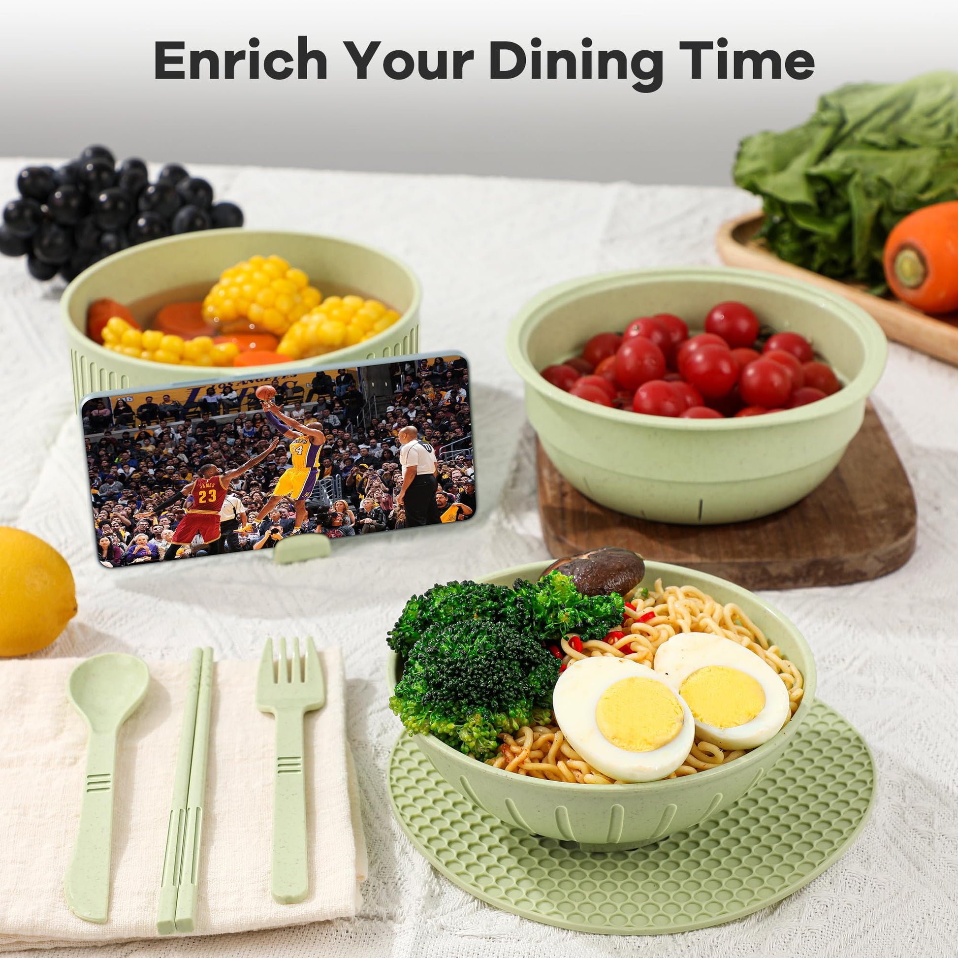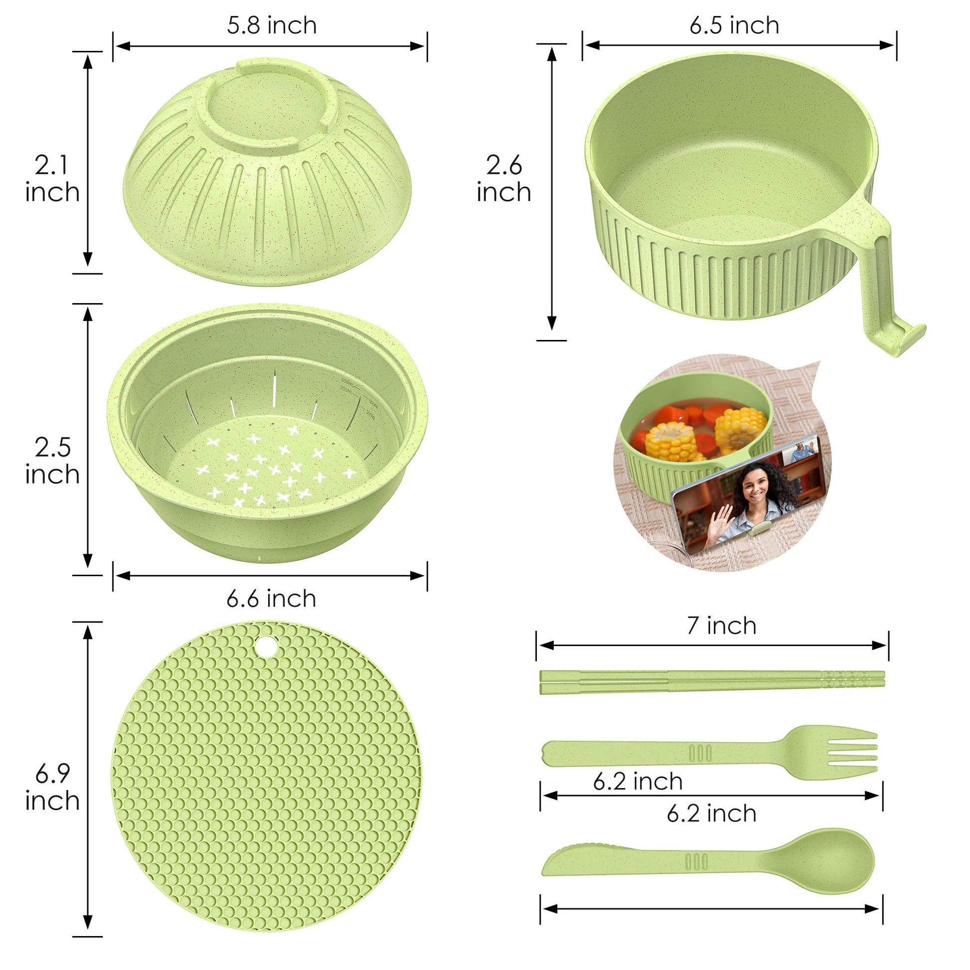 Ramen Bowl with Handles, 2 Set Wheat Fiber Ramen Cooker Microwave with Strainer, 34oz Noodle Bowl with Pot Mat Spoon Chopsticks Fork for Home, School, Office, Dorm, Picnic or Gift