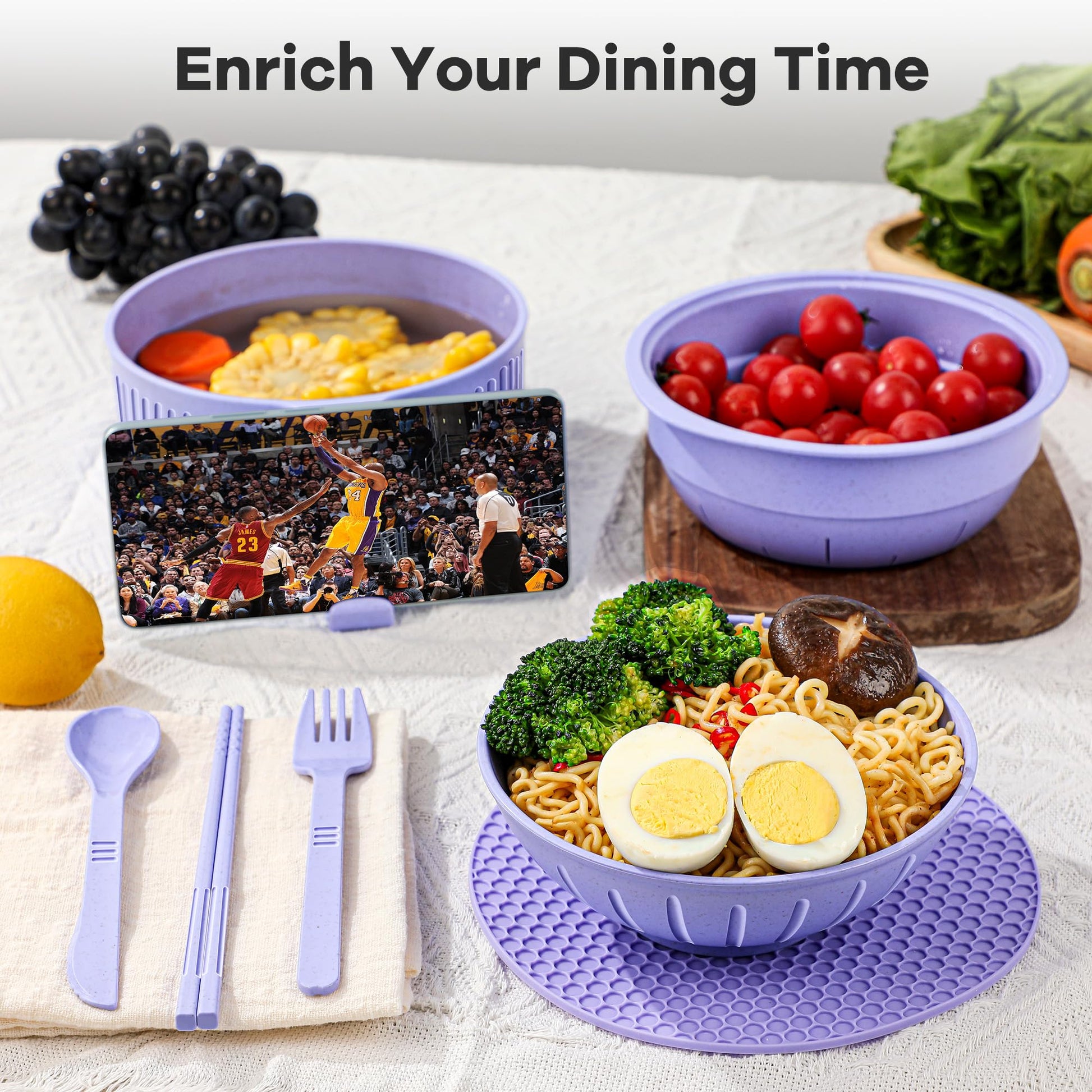 - 【Package includes】 You will receive 2 sets of ramen bowls in different colors, each set includes small bowl, draining bowl, large bowl, chopsticks, spoon, fork, pot mat. Each piece is carefully designed, and together they form a complete functional set that is our must-have multifunctional tableware.